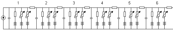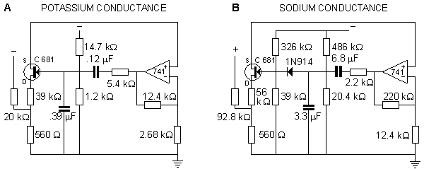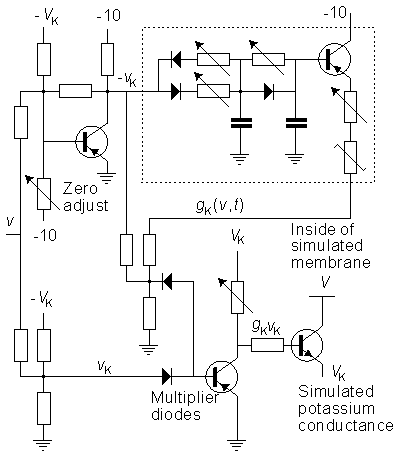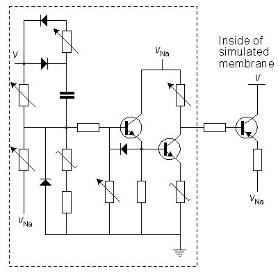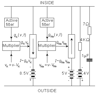 In the electronic realization the voltages of the biological membrane are multiplied by 100 to fit the electronic circuit. In other quantities, the original values of the biological membrane have been used. In the following, the components of the model are discussed separately.
