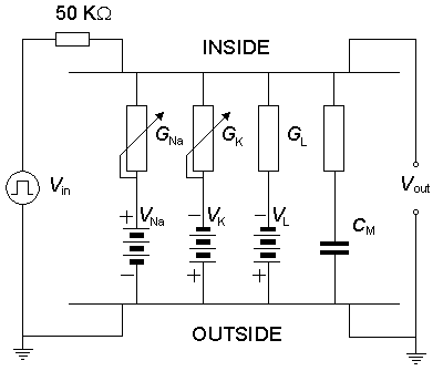 The electronic circuits in the Lewis neuromime had provision for inserting (and varying) not only such constants as GK max, GNa max, VK, VNa, VCl, which enter the Hodgkin-Huxley formulation, but also th, tm, tn, which allow modifications from the Hodgkin-Huxley equations. The goal of Lewis's research was to simulate the behavior of a neuronal network, including coupled neurons, each of which is simulated by a neuromime; this is documented later in this chapter.