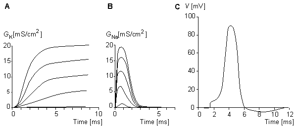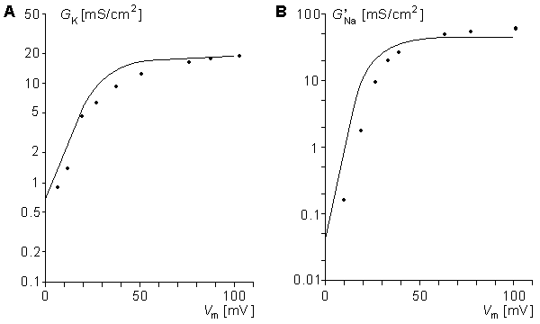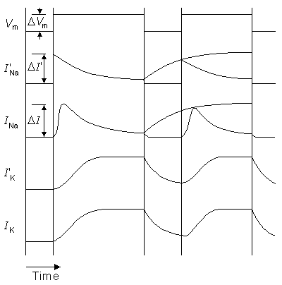Figure 10.7 illustrates the steady-state values for the potassium and sodium conductances as a function of applied voltage. Note that for potassium conductance the value given is the steady-state value, which it reaches in steady state. For sodium the illustrated value is
