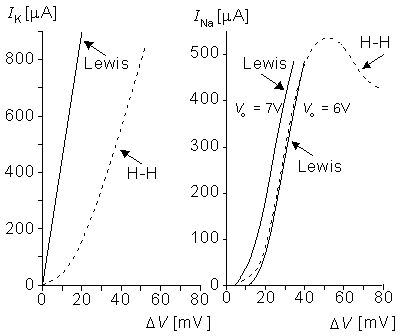 From Figure 10.10 we find that when the stimulation current begins, the sodium ion current determined by Lewis (I'Na) rises to its peak value almost immediately, whereas the sodium ion current of the Hodgkin-Huxley biological nerve (INa) rises much more slowly. The exponential decay of the current occurs at about the same speed in both. The behavior of the potassium ion current is very similar in both the model and the biological membrane as simulated by Hodgkin and Huxley.