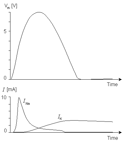 The full membrane model was obtained by connecting the potassium and sodium conductances in series with their respective batteries and simulating the membrane capacitance with a capacitor of 4.7 nF and simulating the leakage conductance with a resistance of 200 Wk . The results from the simulation of the action pulse are illustrated in Figure 10.8..