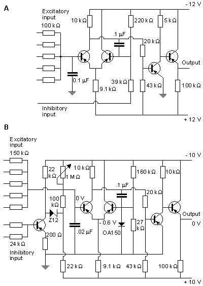 The circuit of the Harmon neuron model is given in Figure 10.13. Figures 10.13A and 10.13B show the preliminary and more advanced versions of the circuit, respectively. The model is equipped with five excitatory inputs which can be adjusted. These include diode circuits representing various synaptic functions. The signal introduced at excitatory inputs charges the 0.02 µF capacitor which, after reaching a voltage of about 1.5 V, allows the monostable multivibrator, formed by transistors T1 and T2, to generate the action pulse. This impulse is amplified by transistors T3 and T4. The output of one neuron model may drive the inputs of perhaps 100 neighboring neuron models. The basic model also includes an inhibitory input. A pulse introduced at this input has the effect of decreasing the sensitivity to the excitatory inputs..