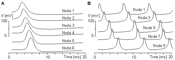 Figures 10.16A and 10.16B illustrate the simulation of propagation of an action pulse in a model consisting of a chain of axon units, as described in Figure 10.15. Curve A represents the case with a chain of six units, and curve B a continuous ring of 10 units. In the latter, the signals are recorded from every second unit. A six-unit model represents a section of a squid axon 4 cm long and 1 mm in diameter. Figure 10.15A shows that the conduction time of the action pulse from unit three (where it has reached the final form) to unit six (i.e., three increments of distance) is 1.4 ms. Because the full six-unit model forms five increments of distance, the modeled conduction velocity was 17 m/s. This is comparable to spike conduction velocities (14 - 23 m/s) measured in squid giant axons..